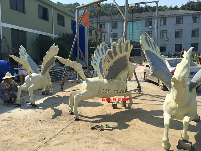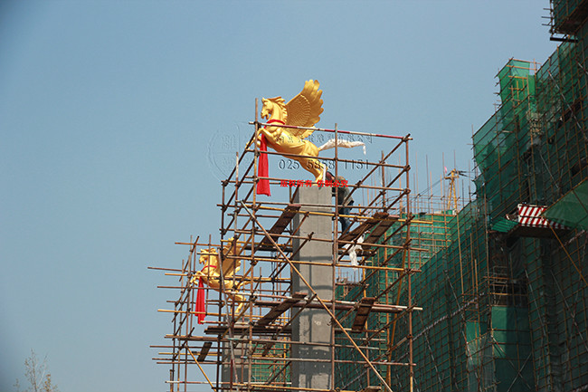 尺寸:《馬頭魚尾》雕塑,高4.75米,《飛馬》雕塑,高2.25米